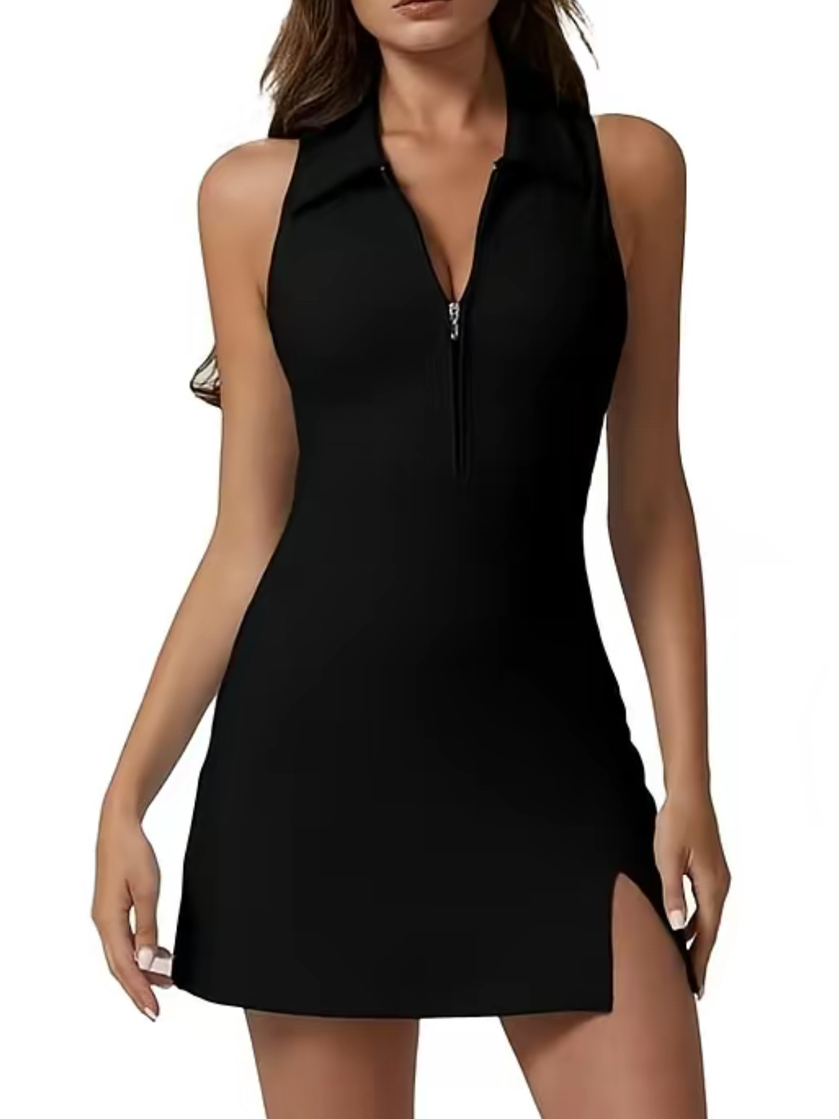 Front Zip Polo Neck Backless Yoga Dress With Built In Shorts And Pockets