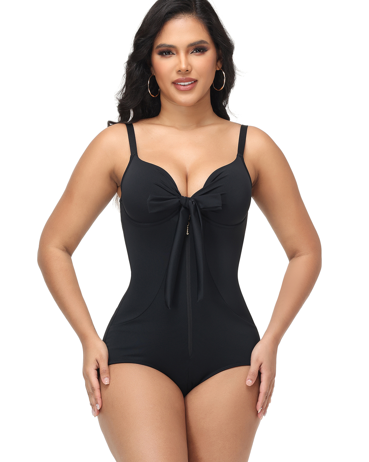 Shaping Deep V Neck Swimsuit with Zipper and Bow Decoration