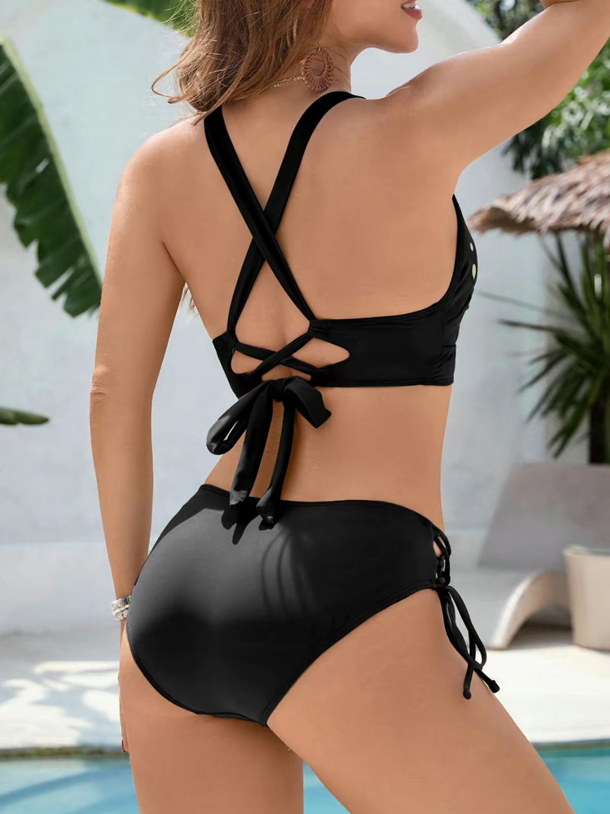 Women's Petal Shaped Hollowed Out V Neck Top And Thong Mid Waist Swim Trunks Two Piece Swimsuit